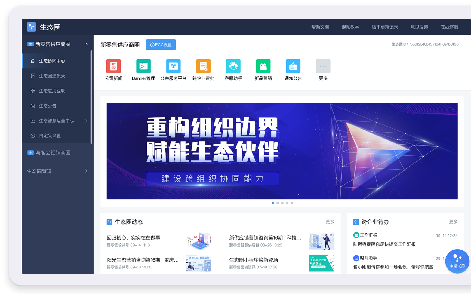 云之家生态圈协同门户帮助企业连接每一位生态伙伴,助力实现跨企业业务互联,打造互利共赢的知识共享体系
